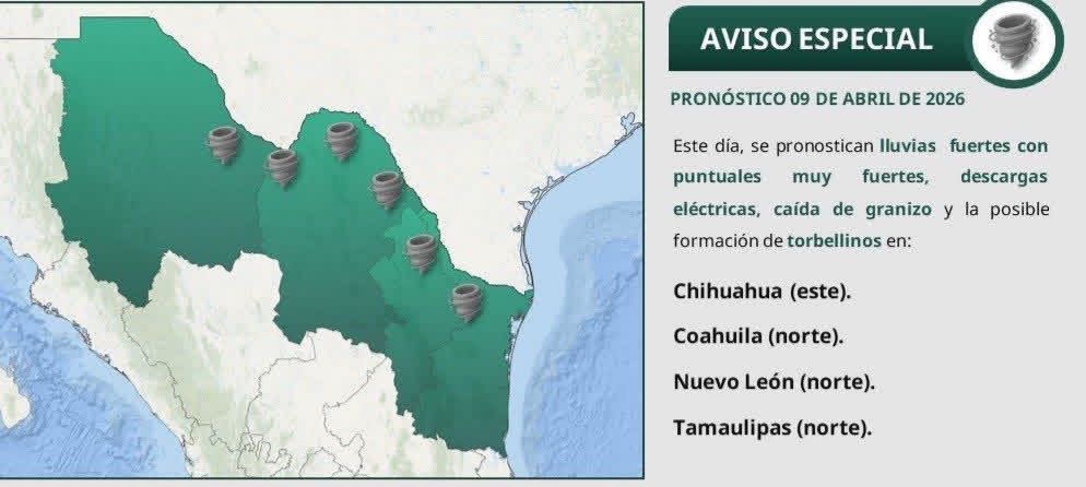 Lluvias fuertes, granizo y posibles torbellinos amenazan el norte y noreste de México